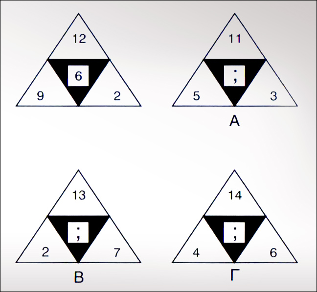Στο τρίγωνο Α είναι ο αριθμός 4, στο Β ο 1 και στο Γ ο 10.