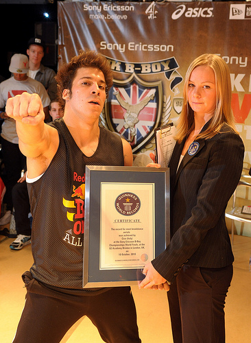 Το ρεκόρ καταγράφηκε στον τελικό του διαγωνισμού Sony Ericsson UK B-Boy, στο Λονδίνο στις 10 Οκτωβρίου του 2010.