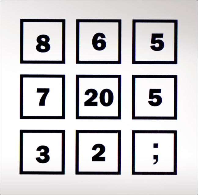 Το άθροισμα των τεσσάρων αριθμών που βρίσκονται στις γωνίες του τετραγώνου και το άθροισμα των τεσσάρων αριθμών που βρίσκονται στα μεσαία κουτιά είναι το ίδιο και ίσο με 20, που είναι γραμμένο στο κεντρικό κουτί.