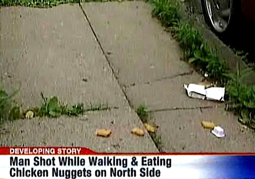 «Άντρας πυροβολήθηκε την ώρα που περπατούσε και έτρωγε chicken nuggets», λέει το σουπεράκι. Κι εδώ βλέπουμε τα chicken nuggets…