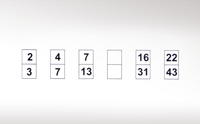 Από το επάνω τετράγωνο λείπει το 11 και από κάτω το 21. Τα νούμερα της πρώτης σειράς ανεβαίνουν κατά 2,3,4,5 και 6 σε κάθε βήμα.