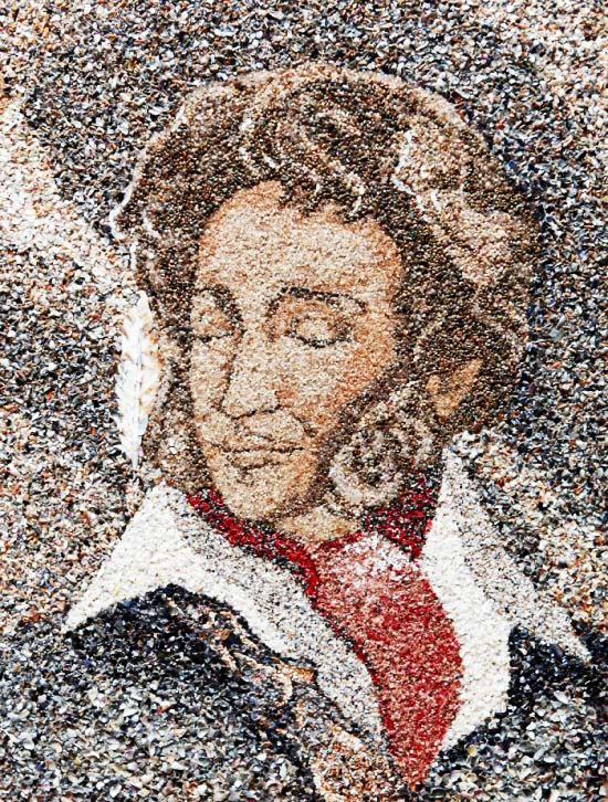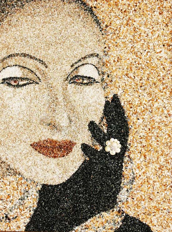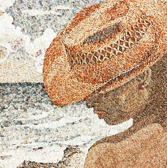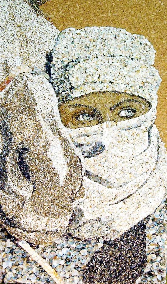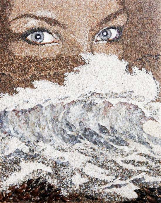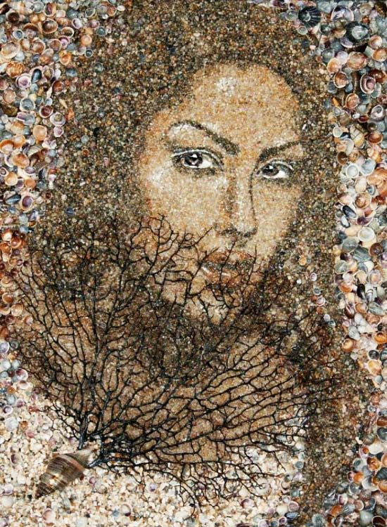 Προκειμένου να δημιουργήσει τα παρακάτω πορτρέτα χρησιμοποίησε αγνά, φυσικά υλικά κυρίως άμμο, κοχύλια, αλλά και ρίζες και φλοιό δέντρων.