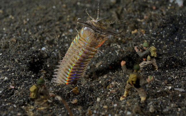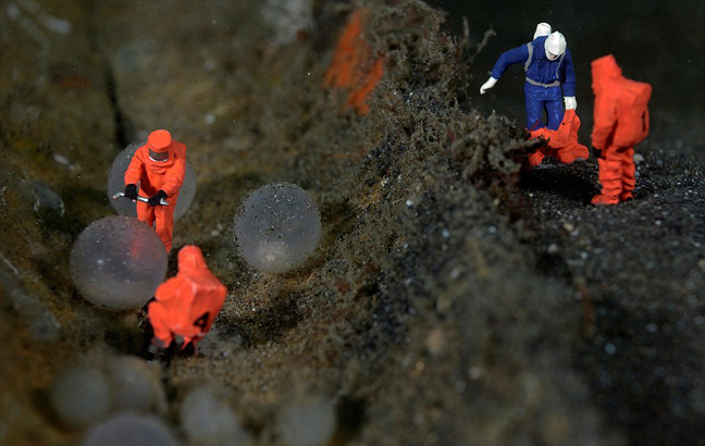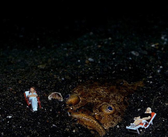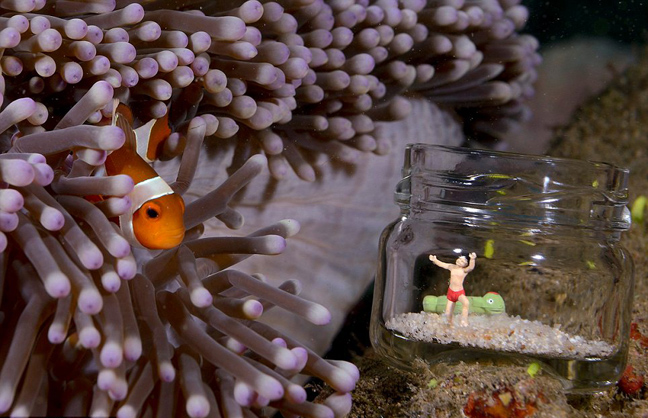 Συγκεκριμένα τοποθέτησε τις μικροσκοπικές φιγούρες γύρω από σπάνια πλάσματα που απαθανάτισε στον βυθό της Μπόρνεο και της Ινδονησίας.
