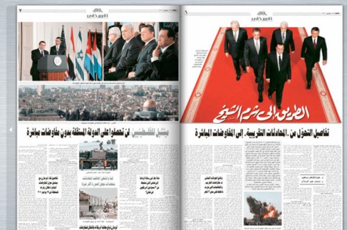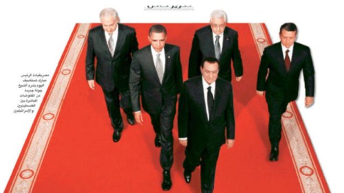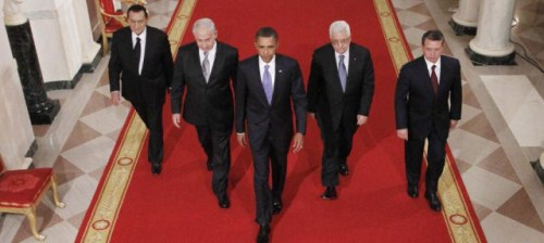 Στην πρώτη φωτογραφία βλέπουμε από αριστερά προς τα δεξιά: τον Αιγύπτιο πρόεδρο Χόσνι Μουμπάρακ, τον Ισραηλινό πρωθυπουργό Βενιαμίν Νετανιάχου, τον Αμερικάνο πρόεδρο Μπάρακ Ομπάμα, τον Παλαιστίνιο ηγέτη Μαχμούτ Αμπάς και τον βασιλιά Αμπντουλάχ της Ιορδανίας. Το στιγμιότυπο είναι από την συνάντηση τους κατά την διάρκεια των συζητήσεων για λύση στο Παλαιστινιακό.
