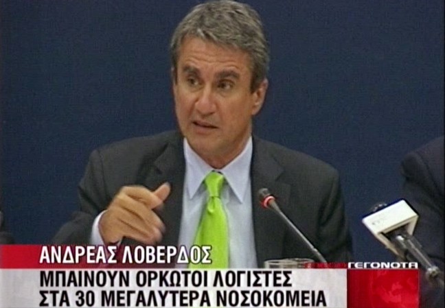 Τα χρώματα του γιλέκου που φορούν οι εργάτες των δήμων που ασχολούνται με την καθαριότητα ή οι ποδηλάτες που κυκλοφορούν νύχτα, επέλεξε ο υπουργός υπουργός Υγείας και Κοινωνικής Αλληλεγγύης κ Λοβέρδος για τη γραβάτα του, σήμερα στη συνέντευξη τύπου.