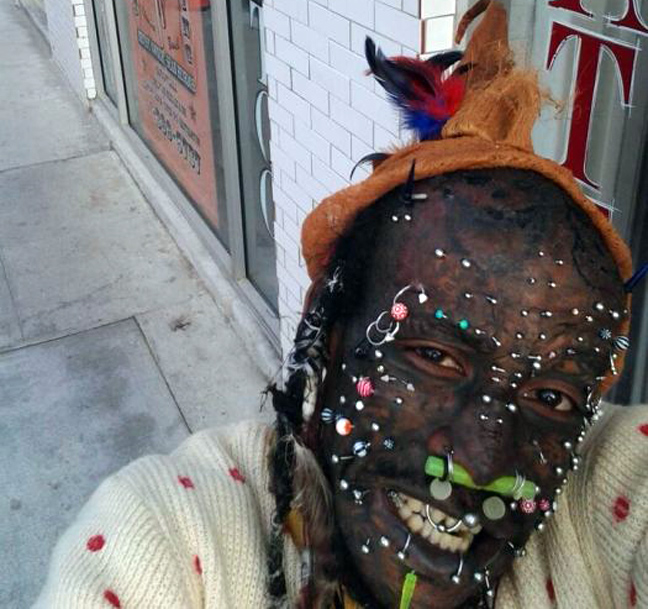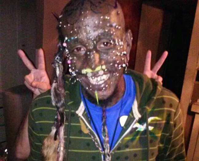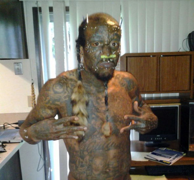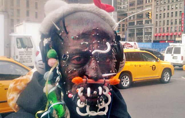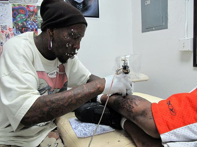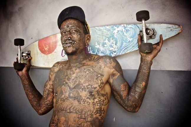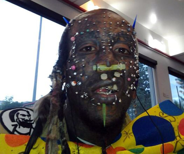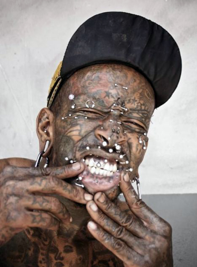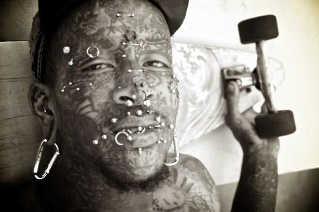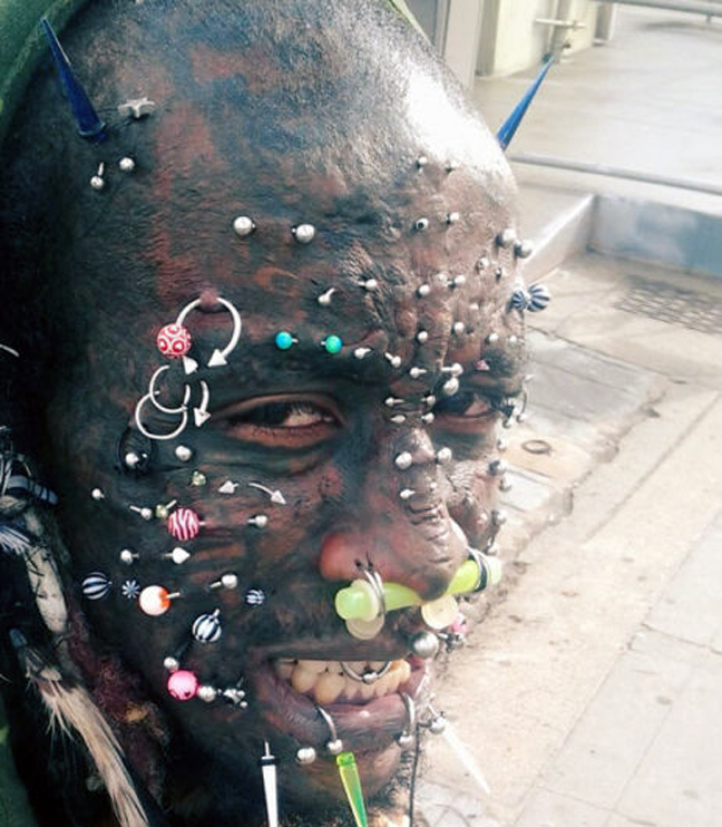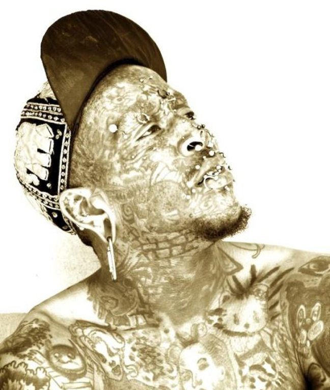 Έχει σε ολόκληρη την επιφάνεια του κορμιού του τατουάζ και το πρόσωπό του είναι γεμάτο με piercing.