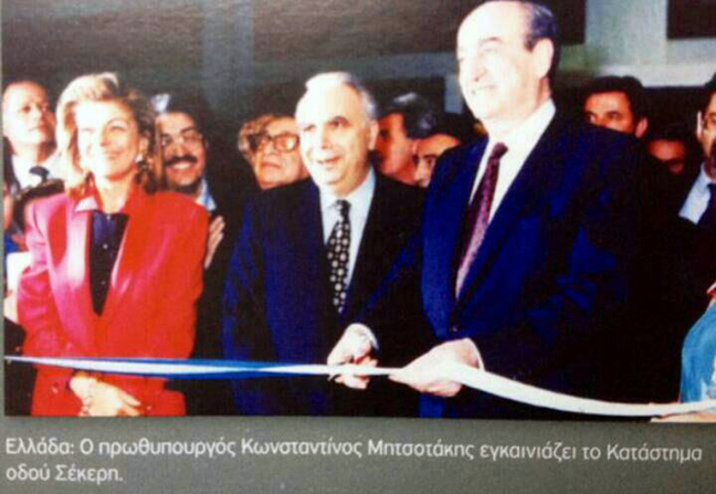Η συγκεκριμένη φωτογραφία δείχνει τον τότε πρωθυπουργό Κωνσταντίνο Μητσοτάκη να κόβει την κορδέλα και να εγκαινιάζει το πρώτο κατάστημα της Τράπεζας Κύπρου επί της οδού Σέκερη στο Κολωνάκι.