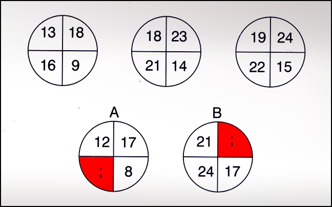 Ξεκινάμε από τον πάνω αριστερά αριθμό και κινούμαστε δεξιόστροφα. Προσθέτουμε το 5 γαι να πάρουμε τον δεύτερο αριθμό, αφαιρούμε το 9 για να πάρουμε τον τρίτο και προσθέτουμε 7 για το τελευταίο νούμερο