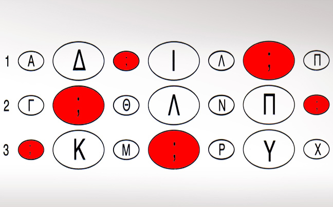 Από τη γραμμή 1 λείπουν τα Ζ και Ξ, από τη 2 τα Z και Σ και από την 3 το Η και το Ο.