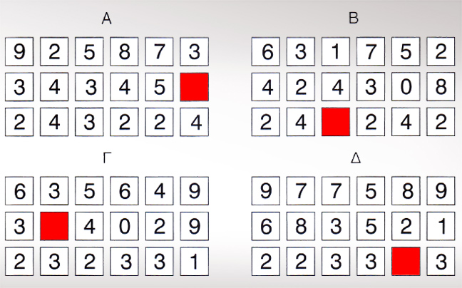 Η λύση: Από το Α λείπει ο αριθμός 3, από το Β ο 4, από το Γ ο 3 και από το Δ ο 3.