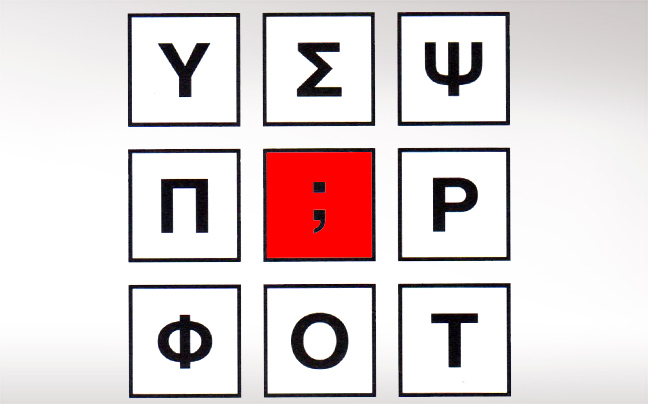 Θεωρούμε την αντιστοιχία Ω=1, Ψ=2 και Χ= 3 κλπ. Προσθέτουμε τα γράμματα της πρώτης γραμμής ή στήλης με τα γράμματα της τρίτης γραμμής ή στήλης αντίστοιχα και το αποτέλεσμα το τοποθετούμε στα ενδιάμεσα τετράγωνα που ακολουθούν.