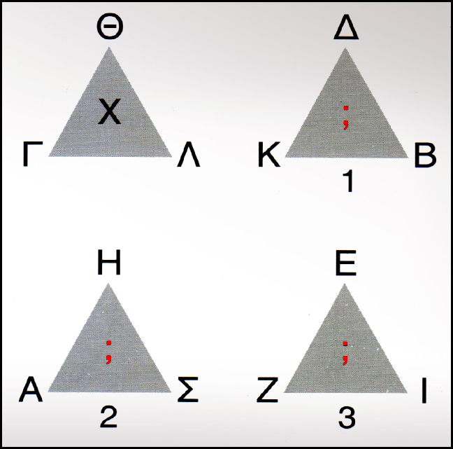 Θεωρούμε την αντιστοιχία Α=1, Β=2 κλπ. Προσθέτουμε τα γράμματα που υπάρχουν εξωτερικά του τριγώνου και το αποτέλεσμα τοποθετείται στο εσωτερικό με τη μορφή γράμματος.
