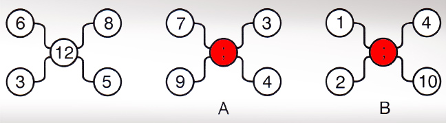 Πολλαπλασιάζουμε τους αριθμούς που βρίσκονται διαγώνια ο ένας με τον άλλον και αφαιρούμε τα γινόμενά τους. Τέλος, τη διαφορά τη διπλασιάζουμε και το αποτέλεσμα το τοποθετούμε στον κεντρικό κύκλο.