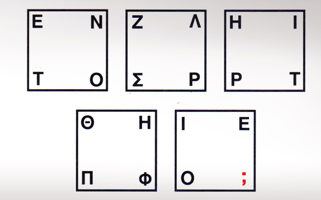 Τα πάνω αριστερά και τα κάτω δεξιά γράμματα αυξάνονται κατά ένα γράμμα και δύο αντίστοιχα, ενώ τα πάνω δεξιά και τα κάτω αριστερά γράμματα μειώνονται κατά δύο γράμματα και ένα γράμμα αντίστοιχα.