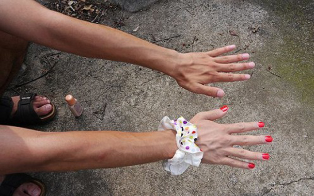 Αρχικά βάζει make-up, μετά βάφει τα νύχια του κόκκινα και δίνει και μια φινετσάτη πινελιά φορώντας ένα πολύχρωμο λαστιχάκι για τα μαλλιά.