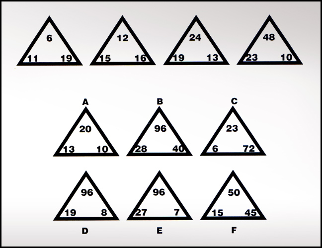 Σε κάθε τρίγωνο ο αριθμός αριστερά αυξάνεται κατά τέσσερα, ο αριθμός δεξιά μειώνεται κατά τρία και ο αριθμός της κορυφής διπλασιάζεται κάθε φορά.