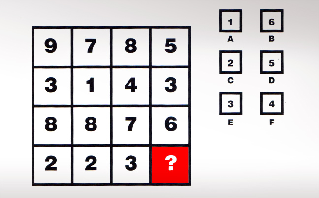 Διαιρούμε το τετράγωνο σε τέσσερα τμήματα 2 x 2. Οι τέσσερις αριθμοί σε κάθε τμήμα δίνουν άθροισμα 20.