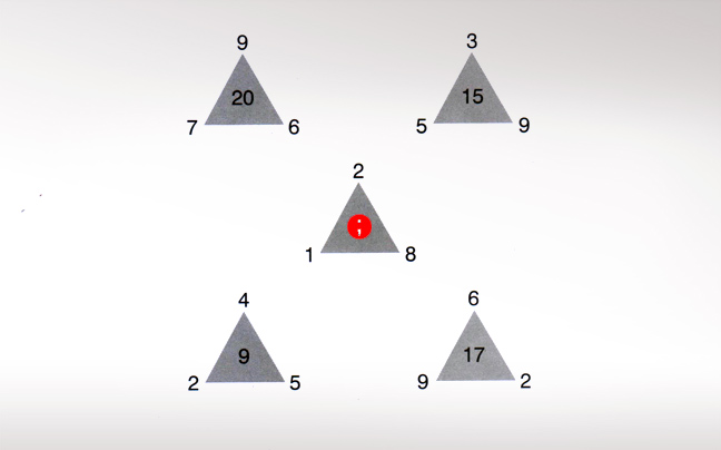 Προσθέτουμε τους αριθμούς που βρίσκονται στο εσωτερικό των πάνω τριγώνων και το ίδιο κάνουμε και για τα κάτω τρίγωνα. Στη συνέχεια αφαιρούμε από το άθροισμα των πάνω το άθροισμα των κάτω τριγώνων και το αποτέλεσμα το τοποθετούμε στο κεντρικό τρίγωνο.