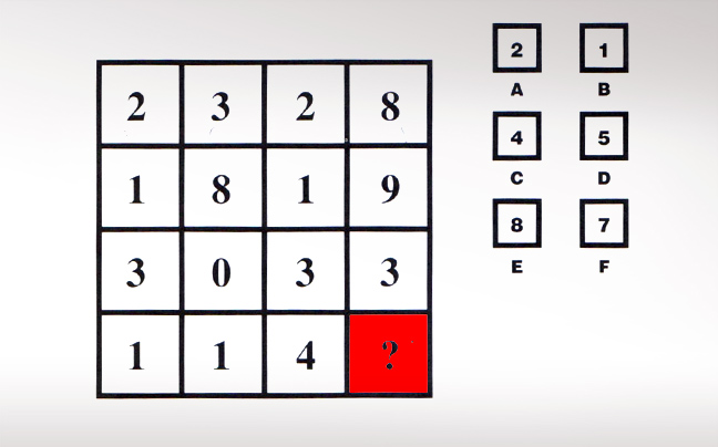 Ο,ΤΙ ΝΑ 'ΝΑΙ #Γρίφος Γρίφος: Ποιος αριθμός λείπει; H λύση 30·09·2013 13:00 3 σχόλια Η λύση: Ο αριθμός 5 το D. Σε κάθε γραμμή ισχύει A x B + C = D