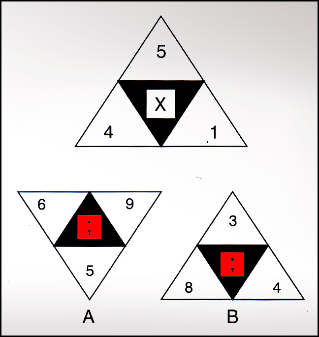 Προσθέτουμε τους αριθμούς που βρίσκονται στις τρεις κορυφές του κάθε τριγώνου και το άθροισμά τους το γράφουμε με λατινικούς χαρακτήρες.