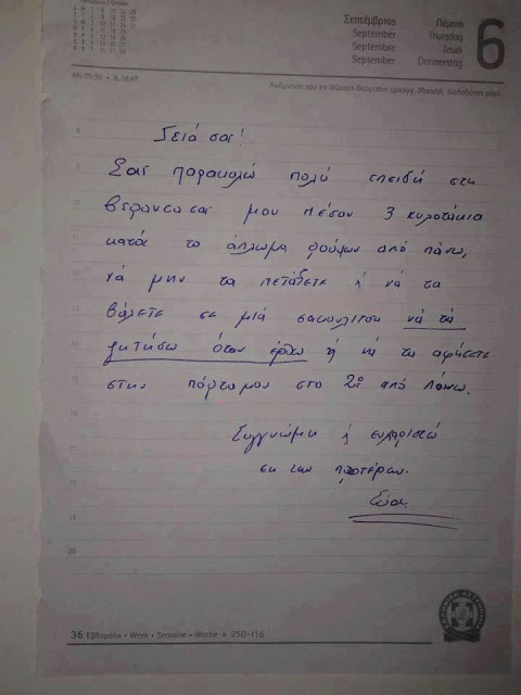 Το συγκεκριμένο μήνυμα γράφτηκε πάνω σε ημερολόγιο της ελληνικής αστυνομίας. Ωστόσο δεν είναι γνωστό αν όντως το άτομο που το έγραψε είναι αστυνομικίνα ή απλά έτυχε να χρησιμοποιήσει το συγκεκριμένο χαρτί.