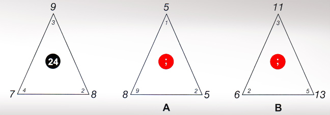 Πολλαπλασιάζουμε τους αριθμούς που βρίσκονται μέσα στο τρίγωνο, προσθέτουμε τους αριθμούς που βρίσκονται έξω από το τρίγωνο και το αποτέλεσμα των δύο πράξεων, όπου είναι το ίδιο, είναι αυτό που λείπει από κάθε τρίγωνο.