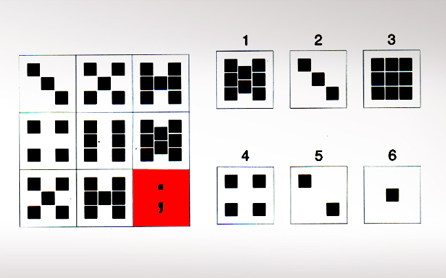 Τη συμπληρώνει το κουτί 3. Ο αριθμός των μικρών μαύρων τετραγώνων αυξάνεται κατά δύο σε κάθε γραμμή και κατά ένα σε κάθε στήλη.