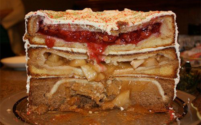 Πρώτος όροφος κολοκυθόπιτα, δεύτερος μηλόπιτα, τρίτος με γέμιση κεράσια.