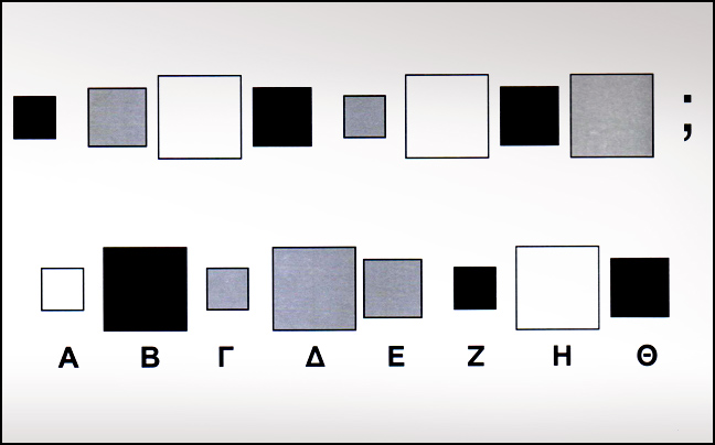 Ο,ΤΙ ΝΑ 'ΝΑΙ #Γρίφος Γρίφος: Ποιο σχήμα συνεχίζει την ακολουθία; Η λύση 07·01·2014 12:00 2 σχόλια Η λύση Το σχήμα Α. Παρατηρούμε την εναλλαγή χρωμάτων, μαύρο – γκρι – άσπρο και μεγεθών.