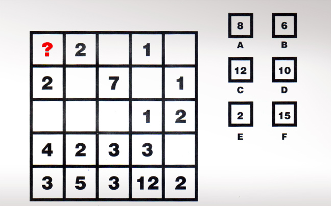 Κάθε μία από τις ευθείες γραμμές με τους πέντε αριθμούς πρέπει να δίνει άθροισμα 25. Η λύση Το 8 δηλαδή το Α.