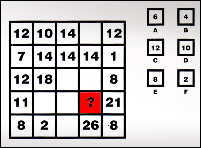 Κάθε μία από τις ευθείες γραμμές με τους πέντε αριθμούς πρέπει να δίνει άθροισμα 50. Ποιος από τους αριθμούς πρέπει να αντικαταστήσει το ερωτηματικό;