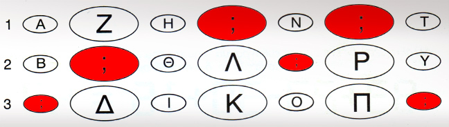 Στην πρώτη σειρά λείπουν τα Μ και Σ, στη δεύτερη τα Ε και Ξ ενώ στην τρίτη τα Γ και Φ.
