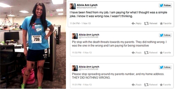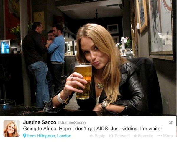 Η Justine Sacco, διευθύντρια επικοινωνίας σε ιντερνετικό κολοσσό, λίγο πριν επιβιβαστεί στο αεροπλάνο με προορισμό την Νότιο Αφρική έκανε το παραπάνω tweet (Πάω στην Αφρική. Ελπίζω να μην κολλήσω AIDS. Πλάκα κάνω. Είμαι λευκή). Το σχόλιο κρίθηκε ρατσιστικό και η δουλειά της… πέταξε!