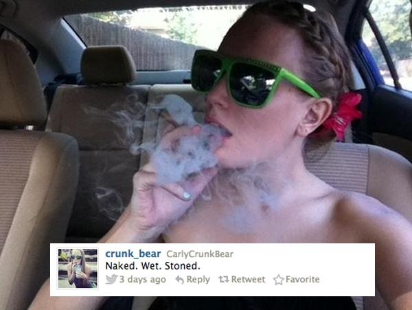 H Carly McKinney αν κι εργαζόταν ως καθηγήτρια σε γυμνάσιο της πόλης Ορόρα στο Κολοράντο, ανέβαζε στο twitter σέξι φωτογραφίες της και status σχετικά με ναρκωτικά όπως το παραπάνω (γυμνή, υγρή, φτιαγμένη). Δεν άργησαν να την πάρουν γραμμή και την απέλυσαν.