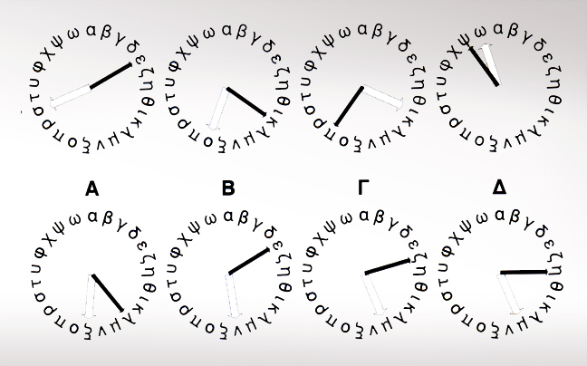 Το Δ. Ο μαύρος δείκτης προχωράει κατά πέντε, έξι, επτά κ.ο.κ. γράμματα τη φορά, ενώ ο λευκός δείκτης πηγαίνει προς τα πίσω κατά τρία, έξι, εννιά, δώδεκα κ.ο.κ. γράμματα τη φορά.