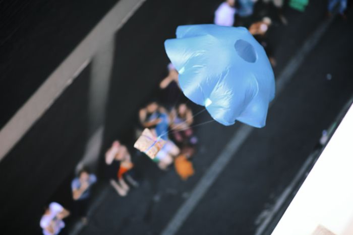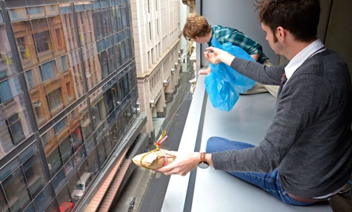 Οι καιροί κρίσης απαιτούν πρωτότυπες επιχειρηματικές κινήσεις. Και όταν η φαντασία οργιάζει έχεις τύπους σαν αυτούς που άνοιξαν σαντουιτσάδικο και παραδίδουν τις παραγγελίες πετώντας τις από το παράθυρο με αλεξίπτωτο…
