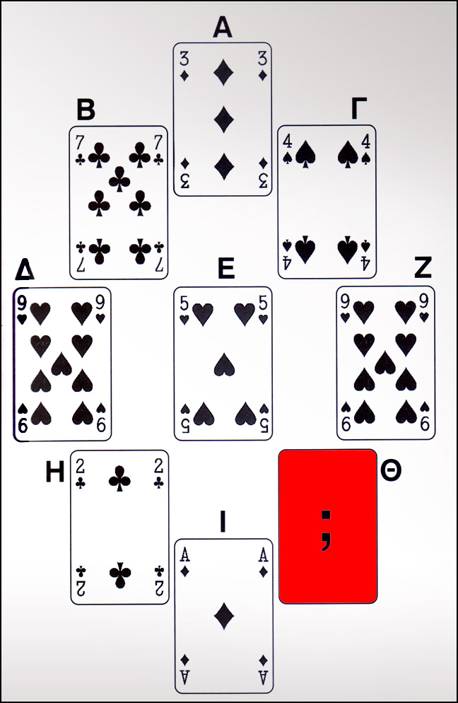 Λείπει το 5 μπαστούνι. Τα χαρτιά που βρίσκονται στην ίδια κατακόρυφη ευθεία έχουν άθροισμα 9. Το χρώμα προχωράει με τη φορά Δ, Β, Α, Γ, Ε, Η, Ι, Θ, Ζ.