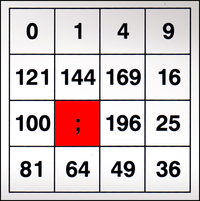 Το 225. Ακολουθώντας σπειροειδή φορά προς τα δεξιά και ξεκινώντας από το 0 επάνω αριστερά, προσθέτουμε το 1, μετά το 3, μετά το 5, μετά το 7, μετά το 9 κ.ο.κ. Επίσης, οι αριθμοί στα κελιά είναι τα τετράγωνα του 0, του 1, του 2, του 3, κ.ο.κ, πάντα σε σπειροειδή φορά.