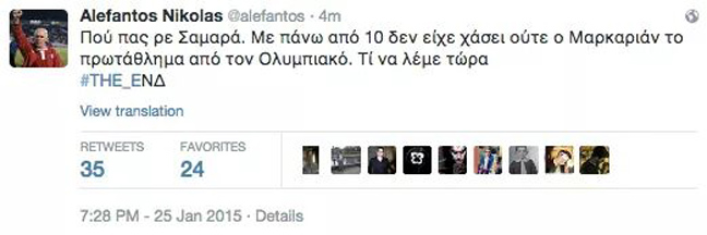 Ο,ΤΙ ΝΑ 'ΝΑΙ #Νέα Δημοκρατία#Νίκος Αλέφαντος Το απολαυστικό σχόλιο του Αλέφαντου για τον Σαμαρά Δείτε τι έγραψε στο twitter 25·01·2015 22:18 3 σχόλια