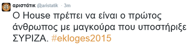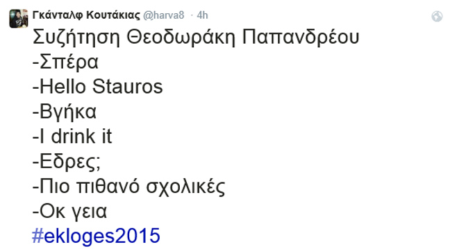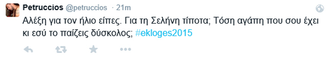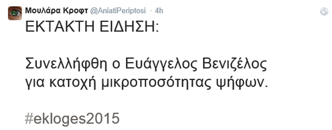 Στη εποχή των hashtag βέβαια οι ταλαντούχοι, διατηρούν λογαριασμούς, με ευφάνταστη πάντα ονομασία, και σπάνε τα ταμεία σε retweets και σχόλια. Σε όλη την προεκλογική περίοδο μέχρι και την Κυριακή των εκλογών το #ekloges2015 συγκέντρωσε αμέτρητα μηνύματα, άλλα εύστοχα, άλλα στοχοπροσηλωμένα κι άλλα πράγματι καυστικά ή αστεία… Το newsbeast.gr συγκέντρωσε και σας παρουσιάζει τα καλύτερα εξ’ αυτών χαρίζοντας φυσικά τα εύσημα στους δημιουργούς τους.