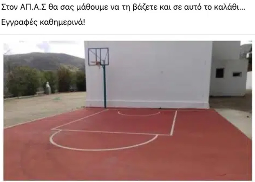 Όπως είναι ξεκάθαρο από τις φωτογραφίες που δημοσιεύει το nasxostimes.gr η τοποθέτηση της μπασκέτας στο σχολείο της Κωμιακής αντί να γίνει στο σωστό σημείο, δηλαδή κάτω από τη ρακέτα, έγινε στο τρίποντο, με την εικόνα να γίνεται viral και να κάνει τον γύρο του ίντερνετ.
