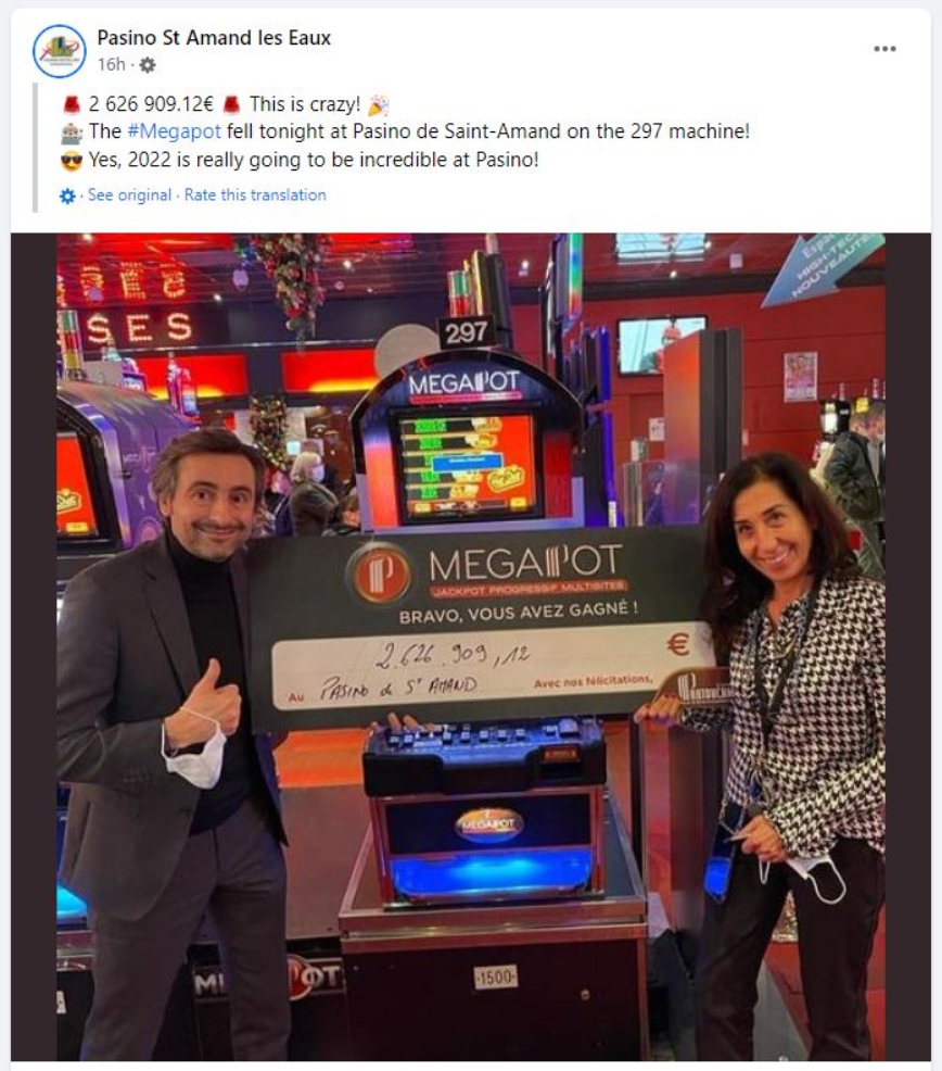 «2.626.909.12 ευρώ, πρόκειται για τρέλα! Το #Megapot έπεσε απόψε στο Πασινό ντε Σεντ-Αμάντ (-λεζ-Ο) στο μηχάνημα 297», αναφέρεται στην σελίδα στο Facebook του συγκροτήματος αυτού.