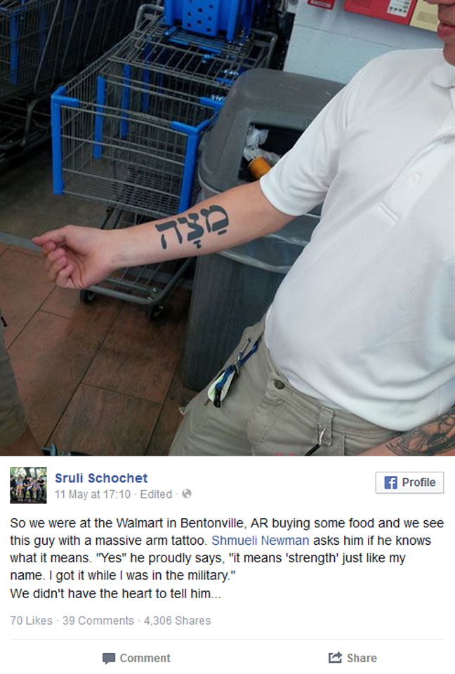 Ο κάτοικος του Λος Άντζελες, Sruli Schochet, ψώνιζε σε ένα κατάστημα όταν συνάντησε τον άντρα με το τατουάζ, ο οποίος του το έδειξε με περηφάνεια.