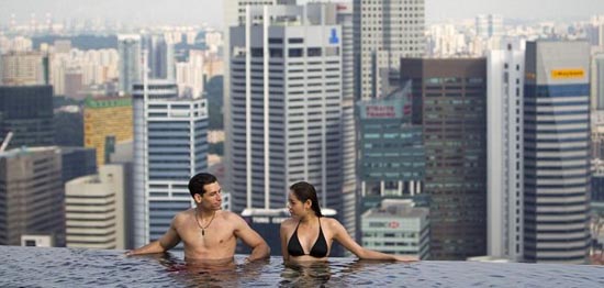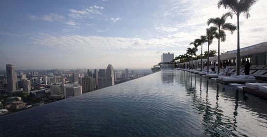 Είναι μακράν η πιο εντυπωσιακή πισίνα που υπάρχει στον κόσμο. Βρίσκεται στην ταράτσα του Marina Bay Sands hotel στην Σιγκαπούρη. Το μήκος της είναι 150 μέτρα και όταν κολυμπάς έχεις την αίσθηση ότι βρίσκεσαι στον αέρα.