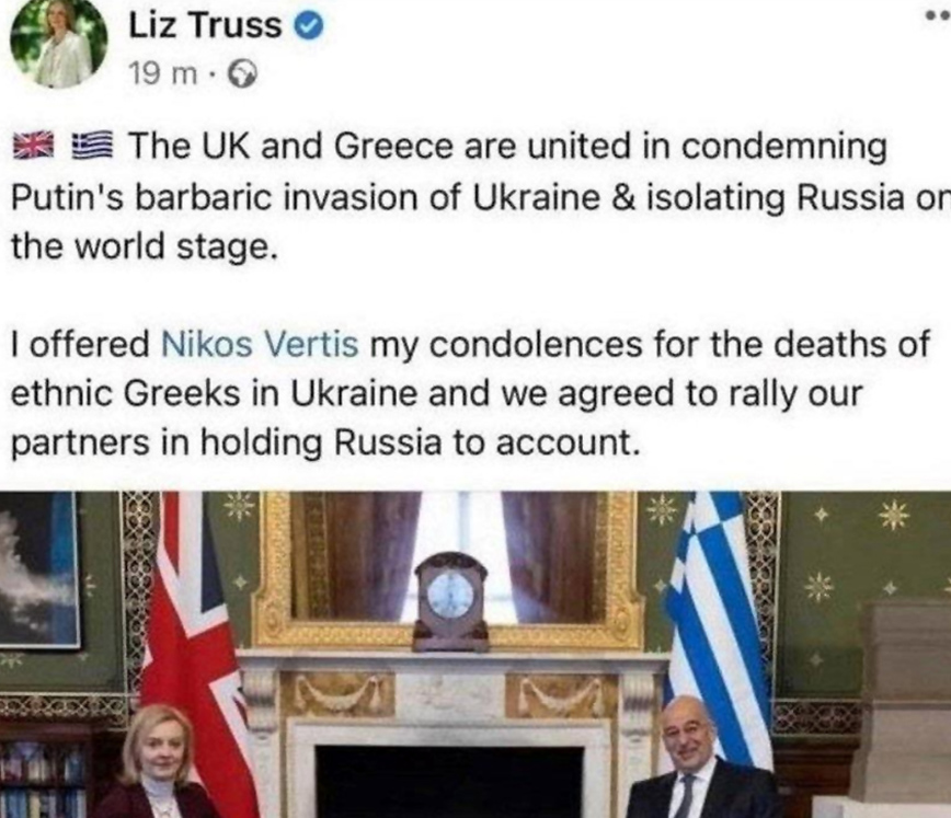 Το λάθος όμως γρήγορα διορθώθηκε και το όνομα του Νίκου Δένδια μπήκε στη σωστή θέση. «Βρετανία και Ελλάδα ενωμένες καταδικάζουν τη βάρβαρη ρωσική εισβολή στην Ουκρανία και απομονώνουν τη Ρωσία στη διεθνή σκηνή. Εξέφρασα στον Νίκο Δένδια τα συλληπητήριά μου για τον θάνατο των Ελλήνων ομογενών στην Ουκρανία και συμφωνήσαμε να συσπειρώσουμε τους εταίρους μας για να λογοδοτήσει η Ρωσία» έγραψε στο διορθωμένο tweet η Liz Truss.
