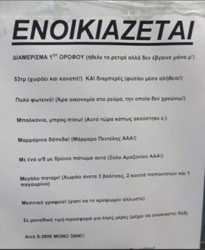 Ένα ενοικιαστήριο με αρκετή δόση χιούμορ που έχει γίνει viral στα μέσα κοινωνικής δικτύωσης και όχι άδικα! Ο ιδιοκτήτης σίγουρα αντιμετωπίζει την καθημερινότητα με αρκετό γέλιο…