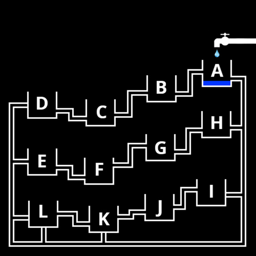 Πρώτα από όλες θα γεμίσει η δεξαμενή F. Αυτό συμβαίνει γιατί τα δοχεία L, K, J και I είναι μπλοκαρισμένα, συνεπώς νερό δεν περνάει από εκεί! Επομένως το νερό περνάει στο επόμενο επίπεδο στο οποίο η πιο χαμηλή δεξαμενή -και αυτή που θα γεμίσει πρώτη- είναι η F.