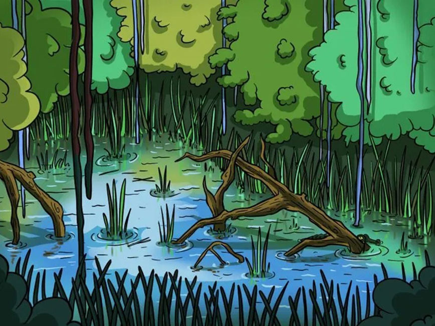 Ο κροκόδειλος καμουφλαριστεί με το νερό και το πράσινο της λίμνης. Συγκεκριμένα κρύβεται πίσω από το κλαδί ενός δέντρου στην κάτω δεξιά πλευρά της εικόνας.