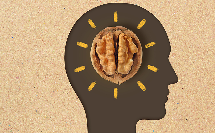 Το σχήμα του καρυδιού το κάνει να μοιάζει εντυπωσιακά με τον εγκέφαλο. Στην πραγματικότητα, μοιάζουν τόσο πολύ που φαίνεται ότι έχουν αριστερό και δεξί ημισφαίριο. Τα καρύδια περιέχουν υψηλή περιεκτικότητα σε ωμέγα-3 λιπαρά οξέα και αναπτύσσουν πάνω από τρεις δωδεκάδες νευροδιαβιβαστές, οι οποίοι βοηθούν στην υποστήριξη της εγκεφαλικής λειτουργίας και προστατεύουν από την άνοια. Γι’ αυτό, όλο αυτό το διάστημα τα καρύδια έχουν το παρατσούκλι «τροφή του εγκεφάλου».