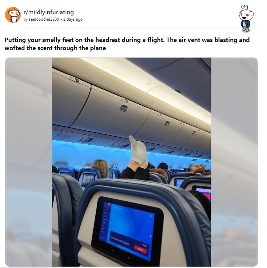 Σύμφωνα με την αρχική ανάρτηση, η απερίσκεπτη επιβάτης φέρεται να είχε στηρίξει τα «δύσοσμα πόδια της» στο μπροστινό κάθισμα κατά τη διάρκεια της πτήσης. Η εικόνα τη δείχνει να ακουμπά τα πόδια στην πλάτη του καθίσματος μπροστά της.